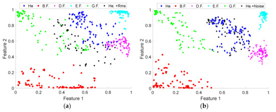 Projection of the extracted set of features resulting for: (a) each of the considered conditions and the healthy condition with a modified RMS (He. +RMS), (b) each of the considered conditions and the healthy condition with added noise (He. +Noise).