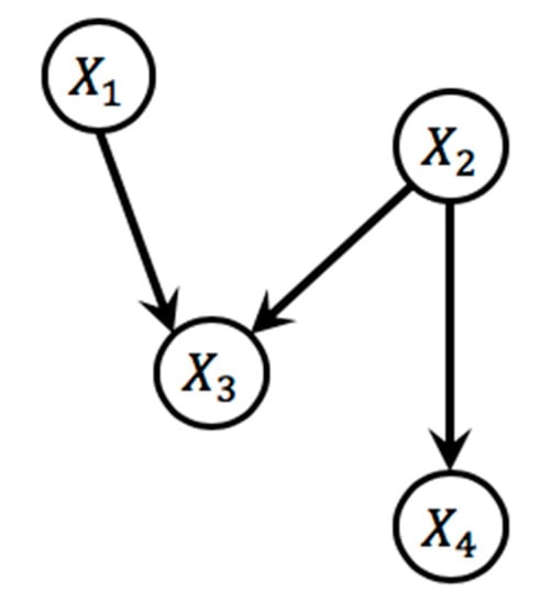Bayesian network (BN) is a probabilistic graphical model which represents conditional dependencies or causal connections between a set of random variables via a Directed Acyclic Graph (DAG). BN is capable of reasoning under uncertainty, where the nodes represent variables (discrete or continuous) and links represent direct connections between them. In addition, BN models the quantitative strength of the connections between variables, allowing probabilistic beliefs about them to be updated automatically as new information becomes available []. The BN-based fault diagnosis consists of three steps: (1) Determine the network structure, (2) establish the conditional probability table (CPT), and (3) carry out probabilistic fault diagnosis based on given evidence. In the BN, the DAG is called the structure and the values in the CPT are called the parameters.