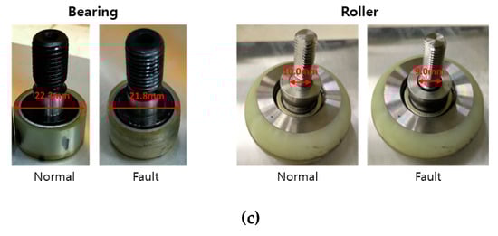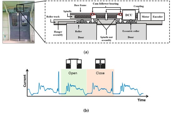 In this study, motor current and encoder signals acquired from the door control unit (DCU) with the sampling rates of 100 Hz and 10 Hz are utilized during the open and close operation of the train door. Figure 2a,b show the train door system test rig and the current signal obtained during the operation. In the figure, the spindle nut assembly moves along the spindle where the cam follower bearing slides within the track of the base frame is parallel to the spindle. Attached to this assembly is the hanger assembly, which hangs the door below and moves along the roller track by the rollers. Note that the eccentric roller exists inside the hanger assembly to prevent vibration during the door operation. Based on the experiences, it is known that the cam follower bearing and roller are prone to fail due to the wear. Therefore, signals are acquired for the conditions of normal and two seeded faults to the bearing and roller. The faults are shown in Figure 2c, in which the outer diameter of the bearing is reduced from 22.3 mm (normal) to 21.8 mm (fault) to induce loosening of locking, and the shaft diameter of the roller is reduced from 10.0 mm (normal) to 9.0 mm (fault) to simulate the wear between the roller and shaft. The door is operated under three different velocity conditions when it opens and closes, which are the acceleration, constant speed, and deceleration.