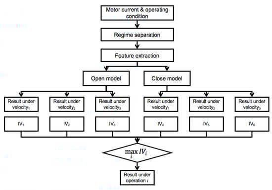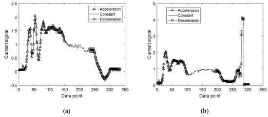 The three regimes can be identified by the encoder, and the acquired signals are shown in Figure 3a,b for the open and close operation, respectively, distinguished by the symbols at each regime. For more accuracy, it is better to carry out fault diagnosis by dividing the signal into these regimes and extracting features, respectively. This is because the features can represent the condition in a certain regime more clearly, while it may not be so for the whole period. Similar attempts have been made in the literature [,] to cluster the data by the velocity regimes.