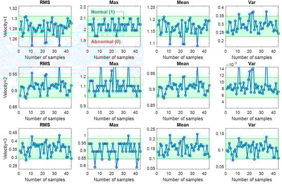 By considering the three regimes corresponding to different input conditions, it also makes sense to evaluate the features separately for different input conditions. Commonly used statistical features, root mean square (RMS), max, mean and variance, are extracted from each regime as illustrated in Table 2, which results in the total of 12 features. Since the BN usually deals with the discrete variables, all the extracted features are transformed into the binary states, assuming that all the features follow normal distribution, namely normal (1) and abnormal (0) where the anomaly is defined by the exceedance of 95% confidence limit. In the table, velocity regimes are labeled as follows: acceleration = 1, constant = 2, and deceleration = 3. Figure 4 illustrates the feature transformation process during the open operation. The output dataset in the database consists of six variables: one velocity state (1, 2, or 3), four feature states (1 or 0), and one door state (norm, bearing, roller). Since the number of datasets in each operation is 57, the total number of datasets for all three operating conditions becomes 171. Among them, 70% are used for the training, which is to find parameters and structure of BN, while the remaining 30% are used to test the model performance.