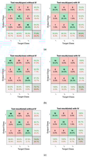 As mentioned, when the system operates under different conditions and multiple diagnosis models are established for each condition, the result can be different for each operating condition. To resolve the conflicting issues in terms of diagnosis performance, one should determine which result is the most reliable. In the train door system, three different fault prediction results were obtained for three velocity conditions. As an example, Table 5 shows this problem, which diagnoses three different door conditions for an open operation. That is, the door is considered to be bearing fault at the acceleration stage (Vel = 1) and the constant speed (Vel = 2), while normal at the deceleration stage (Vel = 3). To overcome this problem, proposed information value (IV) is utilized to obtain a single door condition by following the procedure described in the Figure 6. Table 6 describes the example of IV calculation. Let H be the normal state, with its negation being the other two fault states. Evidence E represents the variables that are directly connected with door state node. For open operation, E becomes Max, Mean, and Var. Based on the calculated IV in Table 6, one can recognize that the deceleration stage (Vel = 3) shows the highest IV with 0.8340, which means among three stages, the deceleration stage is the most reliable. Finally, diagnostic results from the deceleration stage are employed. The test data are used to evaluate the performance of the BN constructed by the training data, and the proposed IV-based decision-making process is applied to the BNs for open and close operations. Note that six IVs are obtained during one reciprocal operation: open and close, three for each operation. Table 7 shows the result of the IV calculation on arbitrarily chosen test data. As shown in the table, IV shows the highest value at the acceleration stage in the close operation. As mentioned, the result for the stage with the highest IV is considered to be the most reliable. Figure 7 compares the accuracy of prediction using BN with and without applying the IV by using the confusion matrix. The confusion matrix is widely used as model performance measure whose row and column represent the predicted class from a trained model and its true class. In this application, classes 1, 2 and 3 represent, respectively, normal, bearing fault, and roller fault. Their diagonal elements represent the number of records that are predicted correctly, whereas nondiagonal elements describe the number of records that are misclassified. In other words, the matrix element of ith row and jth column represent the number of samples that were classified as ith class, whereas their true class is jth class. In addition, the percentage value written below the element represents the ratio between corresponding samples and total number of samples. The percentage values colored as green and red in the last row or column represent the rate of success and fail of classification, respectively, and their summation becomes 100%. The diagonal element at the last column represents the accuracy of the model. The confusion matrix shown in the paper is constructed by using MATLAB software []. Note that the results without IV are those obtained for each of the three velocity stages and the highest probability is determined as a diagnostic result. Therefore, the total number at each column is three times larger than those with IV. On the other hand, the total number of test data for the results with IV reduces to one-third because only the velocity condition whose IV is the maximum among the three is used for prediction. As shown in Figure 7, after applying IV, the estimation accuracy increases during both open and close operations. In addition, test results for the case that uses the open and close operations simultaneously show the highest performance among three approaches using IV. This is because the classifier could utilize six classification results during one cycle, which means that more information can be employed to determine the door health state than other two approaches using single open or close model.