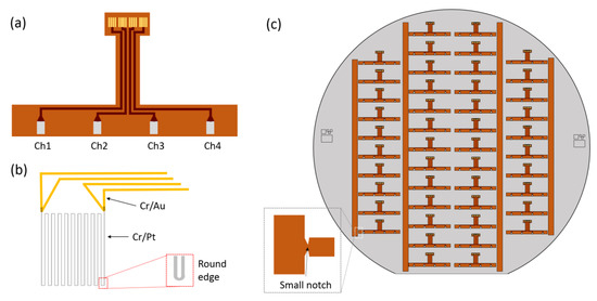The schematic design of the implantable temperature sensor using polyimide is shown in Figure 1. As shown in Figure 1a, the temperature sensor is designed as a multi-channel mechanism to measure the localized temperature change on four different points, namely, buccal, lingual, mesial, and distal points, of a dental implant. Since the sensor adheres around the abutment wing of the dental implant where inflammation is likely to occur, the horizontal length and width of the sensor was 15 and 1 mm, respectively. These dimensions and the shape of the sensor, as well as the number of channels, can easily be modified depending on the size of the abutment wing and dental implant. Each channel has four gold pads to contact with a four-wire measurement circuit. For fully real-time diagnosis, the pads connect to active components under the implanted crown with full insulation. Figure 1b is a design of the platinum (Pt) resistor and the gold (Au) interconnection lines. An additional layer of chromium (Cr) provides adhesion between the Pt or Au noble metals and the polyimide film. Pt was selected as the sensing material due to its high linear correlation between electrical resistance and temperature. Au was chosen as the conductive material and contact pad due to its biocompatibility along with electrical and chemical stability. To minimize self-heating and power consumption during the temperature sensing, the maximum Pt resistance was achieved by a long serpentine design (20 vertical lines) with 3 μm width and 6 μm pitch. To increase the current density uniformity on the serpentine design, the corner was also modified as a round edge, as shown in the inset of Figure 1b. Forty-six sensors are placed together on a single 100 mm diameter wafer, as shown in Figure 1c. To minimize sensor damage during final release from the wafer, a 2 mm width vertical bar-shaped structure was designed to provide support to the sensors with a 200 μm width small notch connecting each sensor to the structure. The notch width was optimized so that it is rigid enough to support each sensor, but small enough to snap during individual detachment from the supporting structure.