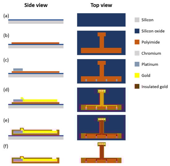 Illustration of the microfabrication process. (a) Deposition of a silicon oxide sacrificial layer on a 100 mm bare silicon wafer. (b) Deposition of the first polyimide layer. Micropatterning of (c) the Cr/Pt layer for temperature sensor and (d) the Cr/Au layer for both interconnection lines and pads. (e) Deposition of a second polyimide layer as an insulation layer, maintaining contact openings by photo-lithography. (f) Remove the sensor from the silicon wafer.
