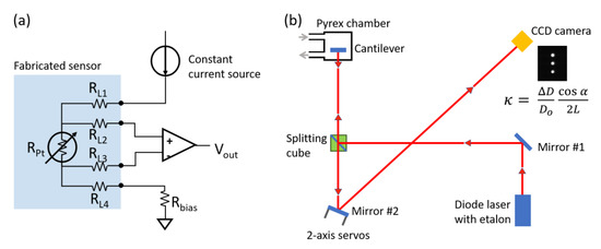 Schematics of (a) Four-wire temperature measurement circuit with Kelvin connection and (b) in situ cantilever curvature measurement system comprised of a multi-beam optical stress sensor. A typical CCD image is shown. The curvature of the cantilever is determined by the average spot separation.