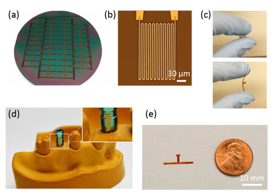 Microfabricated temperature sensors. (a) A total of 46 sensors on a silicon wafer before releasing. (b) Bright-field microscopic image of one channel of Pt resistor and overlapped Au interconnection lines before covered by top insulation layer. (c) Highly flexible sensor without mechanical damage. (d) Adhered temperature sensor around an abutment wing of the dental implant platform. (e) Developed temperature sensor smaller than a penny.