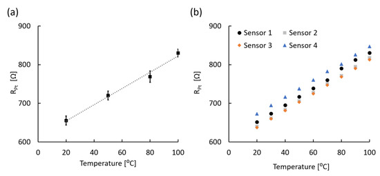 Linear resistance change of developed sensors depending on temperature change between 20 and 100 °C. (a) Averaged resistance plot with linear regression (dotted line; R2 > 98%; N = 20). Error bars represent the standard deviation (SD). (b) Four examples of resistance of independent sensors from multiple batches.