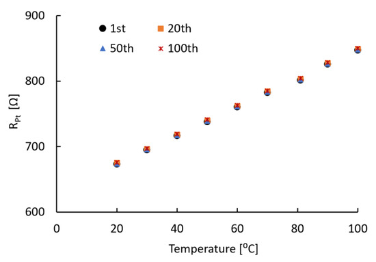 Resistance of Pt resistor for 100 sweeps of the temperature between 20 and 100 °C.