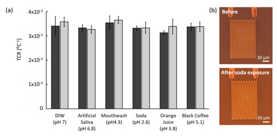 Chemical stability results before (dark gray) and after (light gray) chemical exposure. (a) Stable TCR values before and after immersion in DI water, artificial saliva, and four acidic solutions for 6 to 7 d (N = 19). Error bars represent the SD. (b) Example of microscopic polarized images of the sensor surface before and after exposure to soda for 7 d.