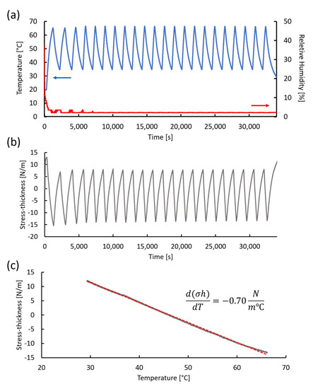 The thermal stress coefficient d(σh)/dT can be determined in two ways. The first involves taking the average Δ(σh)/ ΔT for each of the cycles. From the data shown in Figure 9a,b, the average value of Δ(σh)/ΔT was (−0.68 ± 0.02) N/(m°C). Alternatively, the stress-thickness change during a cooling cycle can be plotted, as shown in Figure 9c. The response was linear over the entire temperature range, with a slope of −0.70 N/(m°C), very similar to the averaged stress response.