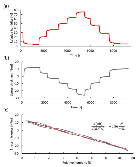 Humidity stress measurement using in situ cantilever curvature. (a) Change in relative humidity produced by mixing dry air and humidified air with a total flow rate of (500 ± 5) mL/min. (b) Stress-thickness response during humidity changes. (c) A plot (gray dots) of stress-thickness vs. relative humidity shown in (a) and (b). The red dotted line represents a linear regression line with a slope of −0.56 N/(m%).