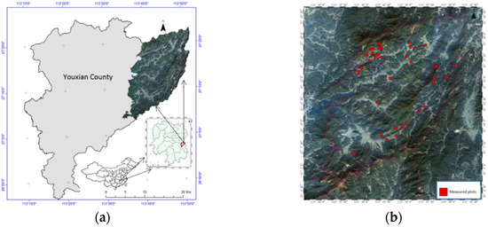 (a) Location of the study area; and (b) distribution of the ground measured plots (red squares) in the study area.