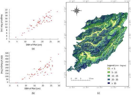 Scatterplot of measured forest parameters and the slope of the study. (a) The relationship between DBH and height; and (b) the relationship between DBH and forest GSV; (c) the slope of the study area derived from ASTER GDEM.