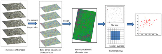 Increasing the SAR images acquired in the same period, which are the time series images, is an effective way to guarantee the reliability of the mapped forest GSV. After pre-processing, the time series polarimetric characteristics, extracted by the Yamaguchi decomposition, were geocoded with external DEM and then registered with reference images. After that, the un-fused and fused polarimetric characteristics are calculated by the temporal average at the pixel scale. The fused polarimetric characteristics were constructed by fusing power of the surface scattering, double-bounce scattering and volume scattering. Due to the mismatches between the measured plots and pixels, the polarimetric characteristics of each plot were extracted by scale matching using the spatial average. Figure 3 is the flowchart of extracting the time series polarimetric characteristics.