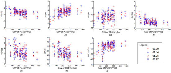 Scatter diagram of GSV and polarimetric variables obtained by the Yamaguchi decomposition from employed four SAR images. (a) surface scattering (Odd), (b) double-bounce scattering (Dbl), (c) volume scattering (Vol), (d) Dbl/Odd, (e) Vol/Odd, (f) Dbl×Vol and (g) and Dbl×Vol/Odd.