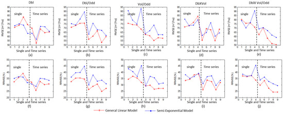 Figure 5 illustrates the RMSE and RRMSE of the time series polarimetric characteristics got by the semi-exponential model and GLM. For each selected independent variable, the RMSE and RRMSE of the time series images are smaller than that of single SAR images. The average RRMSE is about 35.36% for the two models using the power of double-bounce scattering (Dbl) from single SAR image (Figure 5f). With the power of the double-bounce from time series images, the RRMSE decreases to 30.26% and 32.53% for GLM and the semi-exponential model, respectively. The improvements are more significant for Dbl/Odd (Figure 5g), Vol/Odd (Figure 5h) and Dbl×Vol/Odd (Figure 5i). Moreover, for the GLM results, the RRMSE of all variables from time series images is smaller than 30%, and that of variables from single images is larger than 32%.