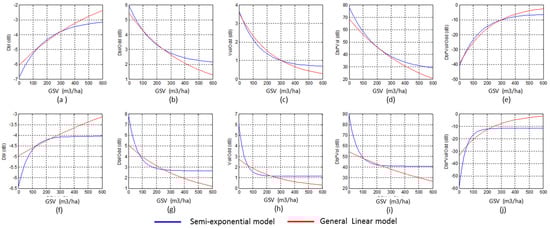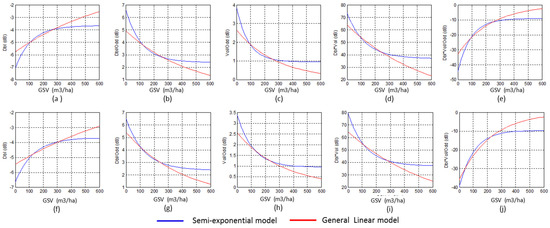 The fitted curves estimated by GLM and the semi-exponential model from single SAR image, (a–e) using the polarimetric characteristics from the image acquired on 30 June 2016 and (f–j) the image acquired on 22 September 2016.