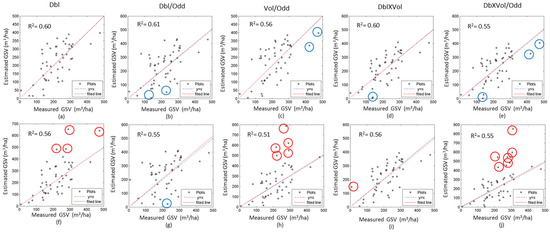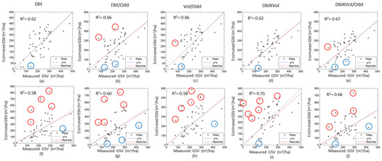 The scatter diagrams between the observed and estimated GSV using the SAR image acquired on 30 June 2016. The results of the GLM (a–e) and the semi-exponential model (f–j) are shown with difference variables. Red circle and blue circle denote the overestimated, and underestimated GSV, respectively.