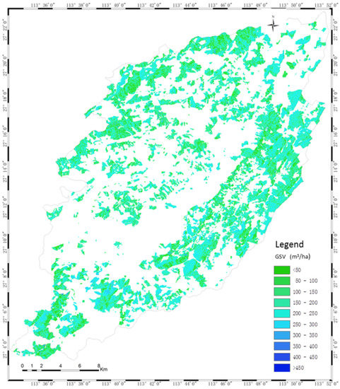 The scattering diagrams between the measured and the estimated GSV (Figure 9) show that the results of GLM have less overestimated or underestimated forest GSV than that of the semi-exponential model. Particularly, in the results of the semi-exponential model, some plots with high GSV induce larger errors and the estimated GSV exceed the rational range. Therefore, we mapped the GSV of the planted Chinese fir forest by GLM using the fused polarimetric characteristics (Figure 10), and the estimated forest GSV of most regions ranges from 100 m3/ha to 450 m3/ha.