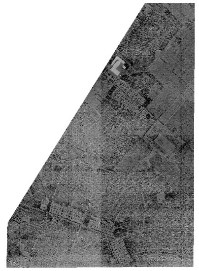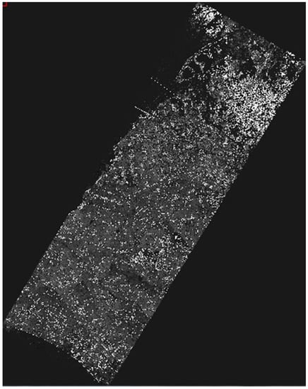 Using the Image Registration Workflow toolbox in the ENVI software, 10 seed points were manually selected for registration. The CHM point-cloud data map was selected as the reference Base Image File, while the hyperspectral CASI image was selected as the Warp Image File to be registered. The registration parameters selected through the Tie Point Generation panel are listed in Table 1. The registration result is shown in Figure 5.
