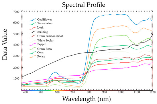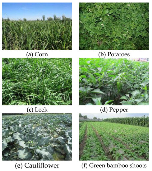 The observed area had more than 10 kinds of land cover types, such as ‘corn’, ‘leek’, ‘cauliflower’, ‘pepper’, ‘potatoes’, and so on. Ground object classification was highly challenging because of this high diversity of the crop types in the field and the imbalance of the land cover types. Figure 3 and Figure 4 demonstrate the average spectral curves of the land cover types and the ground object types for the same data collection period, respectively.