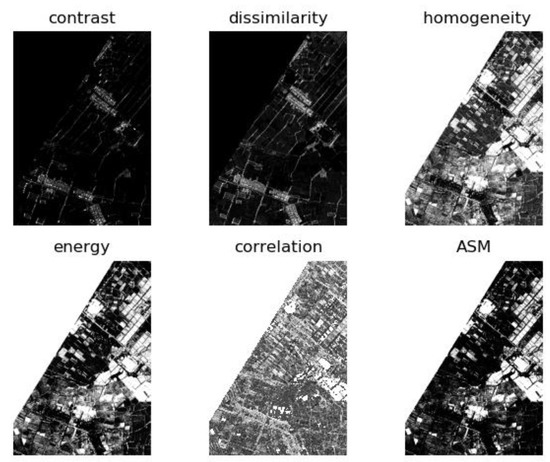 In this paper, six second-order GLCM features were computed, namely the contrast, dissimilarity, homogeneity, entropy, correlation, and the angular second moment (ASM). The GLCM window size was set to be 3 × 3 and the texture features of the hyperspectral image data were obtained, as shown in Figure 8.