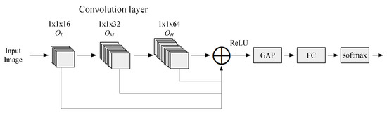 Figure 9 shows the architecture of the proposed hierarchical fusion residual network. This network was divided into three modules whose outputs were OL, OM, and OH, respectively. These modules have 16, 32, and 64 convolution kernels, respectively. Feature maps of different dimensions were output to realize layer-by-layer feature extraction. In order to ensure dimensionality matching before feature fusion, 64 convolutions were performed with convolution kernels. Then, the outputs of the three modules were added and fused. The fused features are mapped by rectified linear unit (ReLU) activation functions and then global average pooling (GAP) were applied [31]. The final feature vectors were generated by inputting the features to fully-connected layers. Finally, a fused feature graph was converted into an output feature vector through the fully-connected network. The output feature vectors were fed to a classifier for ground object classification.