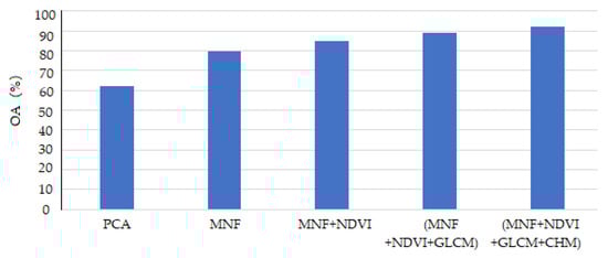 The overall accuracy (OA) values obtained by different feature fusion methods are shown in Figure 10. The results show that the OA value for classification with the MNF features was clearly better than that with single-band PCA. This shows the effectiveness of the spectral features extracted from the key spectral bands of the hyperspectral CASI image based on the MNF transform. The third feature fusion method combined the MNF features with the spatio-spectral features of the hyperspectral CASI image. The fourth feature combination augmented the third combination with textural features of that hyperspectral image. The third and fourth combinations led to significantly improved OA values, indicating that the NDVI and GLCM features can be highly distinctive in ground object classification. The fourth feature combination was augmented by the CHM information to form the fifth feature combination, which demonstrates that the CHM data can improve the discrimination of ground objects with different heights. Therefore, the fused features can fully exploit the hyperspectral and LiDAR data and obtain complementary information from these data sources for ground object classification.