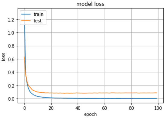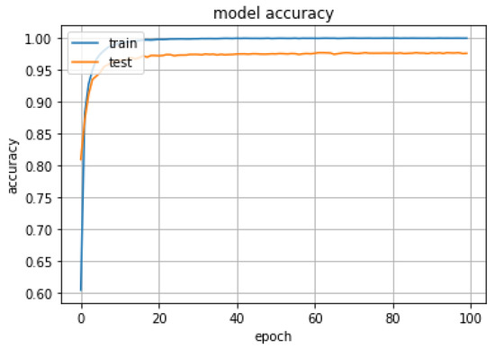 As shown in Figure 11 and Figure 12, when the 20th training epoch was reached, the accuracy reaches its maximum value, and then stabilized at about 98%. The loss function value also decreased to its minimum value at the same time. The experimental results show that due to residual block training, the input was directly transferred to the output, information integrity was protected, and performance degradation was highly eliminated.