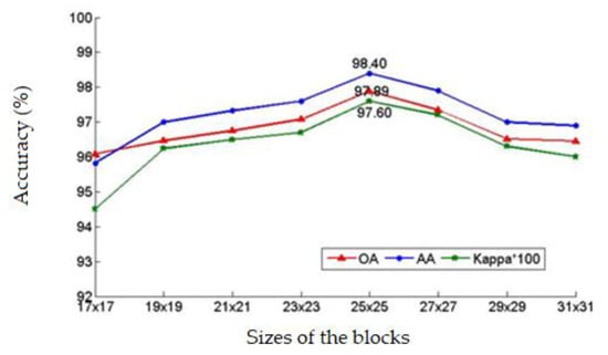 Figure 13 exhibits the variation of the overall accuracy, the average accuracy, and the Kappa coefficient with the increase in the sample block size with a network depth of 32. Obviously, the classification accuracy initially increased, reached a maximum at 25 × 25, and then decreased with the increase of the sample block size. Figure 13 also shows that the sample block size has a certain impact on the classification accuracy in hierarchical fusion residual networks. The result shows that appropriate block size selection as 25 × 25 was important for optimizing classification performance.