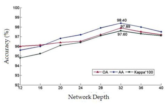 Figure 14 shows the variation of the overall accuracy, the average accuracy, and the Kappa coefficient with the increase in the network depth for a sample block size of 25 × 25. Clearly, with the increase of network depth, the classification accuracy steadily increased, reached a maximum at a network depth of 32, and then started to decline, and the trend of changing was consistent with the three parameters. The M-DRN classification algorithm alleviated the problem of performance degradation with increasing network depth. However, when the network depth was excessively high, over-fitting occurred and the classification accuracy declined to a certain degree. Therefore, M-DRN classifiers can improve the overall classification accuracy by deepening the network to a certain limit.