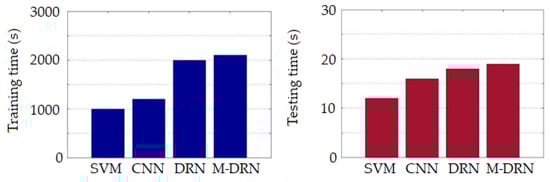 The training and testing times for different network architectures are shown in Figure 15. The training times of the SVM and CNN classifiers with shallow layers were relatively small. Since the DRN classifier had a deeper network architecture, the training time increased. The M-DRN classifier outperformed the DRN one at the cost of a small increase in the computation time. Thus, the M-DRN algorithm remained feasible for practical purposes. While different network architectures can have significantly different training times, they have little differences in terms of the testing time. The network depth (and other several factors) can have noticeable effects on the training time.