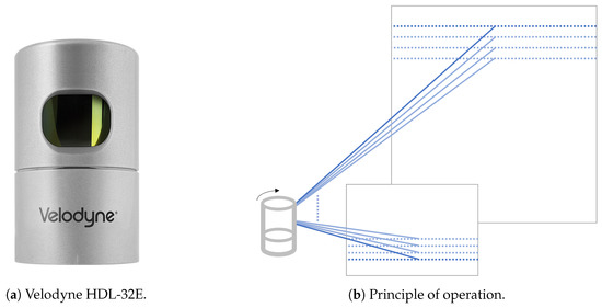 In this work we used the Velodyne HDL-32E LiDAR sensor, Figure 1a. During all the data collections we used it mounted on a pole in the back of the robot, at the height of 1.35 m. The Velodyne HDL-32E [45] is a rotating multi-layer laser scanner. It scans the environment using a set of 32 laser range detectors which rotate together, as illustrated in Figure 1b. The measurement data contains 3D points which represent the surface of the scanned objects (a 3D “point cloud”).