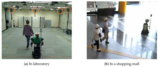 Finally, we also collected data in an actual populated environment—the ATC shopping mall in Osaka in Japan, shown in Figure 3b. During the data collection, a robot with the Velodyne LiDAR was remotely controlled by an operator.