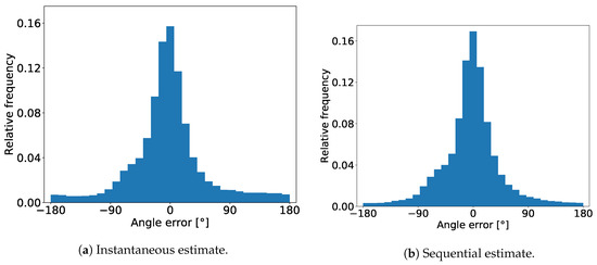 The distributions for both instantaneous and sequential estimates show that the errors are concentrated around 0, with the majority results falling between −90 and +90. One thing that can be noticed is that there are no peaks around ±180, which means that the CNN estimator basically never mistakes the person’s back from the front.