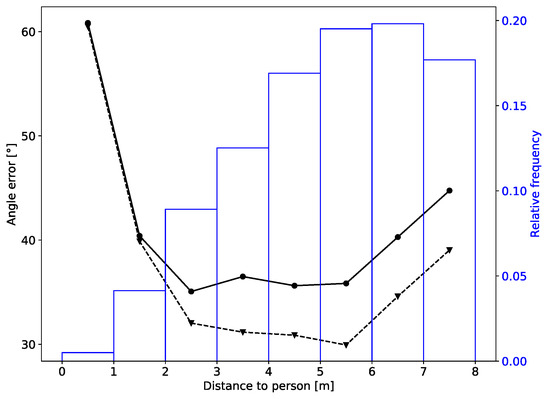 Dependence of the body angle error on the distance to the person: solid line—instantaneous estimate; dashed line—sequential estimate. The figure also shows the distribution of distances in the testing dataset (real world dataset).