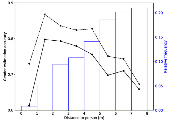 Dependence of the gender estimation accuracy on the distance to the person: solid line—instantaneous estimate; dashed line—sequential estimate. The figure also shows the distribution of the distances in the testing dataset (first day from real world dataset).