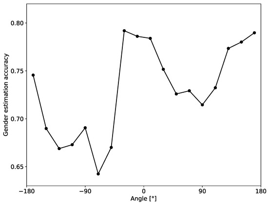 Dependence of the gender estimation accuracy (instantaneous estimate) on the body angle of the person.