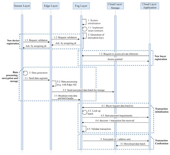Figure 1 illustrates the architecture of the deployed EdgeBoT network, with P2P distributed communication and data exchange. Apart from cloud services and applications running on other powerful computing platforms, manager nodes at the Fog layer represent the bulk of the network nodes that work independently in a fully autonomous way (pre-defined smart contracts or scripts). These require higher computational capabilities to handle a large number of parallel operations. The Fog layer is directly connected to the Cloud layer providing the final step in forming the final link between the Sensor and Cloud layers. The Fog layer is responsible to initialize a network, the System initialization process in the sequence diagram that is shown in Figure 2. The Fog layer is also fully responsible for running the Ethereum network and creating smart contracts. Therefore, edge gateways at the Edge layer first request to join the private Ethereum network (the New device registration block in Figure 2) to obtain the cryptographic keys generated at the Fog layer. By private we do not mean a consortium blockchain where certain nodes have higher authority, but only that new nodes will need to request access to a single manager for joining the blockchain (after which the manager is just a normal node). Edge gateways can connect and handle several sensors and actuators located at the Sensor layer. Sensors are responsible to gather data and send them to the upper layer for processing and storage, the Data processing, encryption and storage block Figure 2. Whenever a new node wants to buy or sell data in the EdgeBoT network, it first needs to register in the network, the New buyer registration block in Figure 2. During this operation, a child key derivation (CKD) function generates both private-public keys for the node. At that point, the buyer node becomes a full member of the network by creating its public key derived from network key and has access to the encrypted history of transactions and all previous data batches that have been generated since the establishment of the platform.