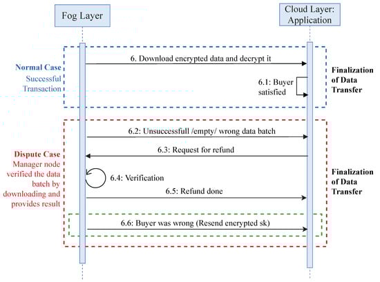 The complete sequence of data transaction in EdgeBoT is illustrated in the transaction initialization block in Figure 2. Whenever an external buyer (a cloud layer application) wants to acquire data, it joins the network and requests a given data batch while using batch headers that are available publicly on the network. A manager node at the Fog layer replies with the transaction price and conditions. If the buyer accepts the conditions, the manager node validates the transaction and sends the unique secret encryption key (derived from CKD function) of the requested data batch by encrypting it with ECDSA, using the buyer’s public key along with the address of the data batch. The buyer downloads the encrypted data batch from cloud layer (storage) and decrypts it using its public key. After getting the required data, possible scenarios occur which are shown in Figure 3. In a normal case, a buyer is satisfied with the received data. In a dispute case, a buyer is dissatisfied with the received data, or even unable to download or decrypt the data. In this case, the buyer can request for a refund. After getting the refund application, a manager node verifies the request by downloading the required data batch. If the buyer’s request is legitimate, the refund request will be processed. If the buyer was wrong, the manager node sends the encrypted sk again, which finalize the transaction request.