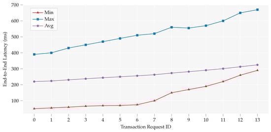 The time that is required to complete a transaction by the edge gateway is measured and subdivided into sections: time required to retrieve metadata (TRD), transaction validation time (VTR), and transaction confirmation time (TCT). The measurements are shown in Figure 5. When considering the available limited resources, it is promising that TRD needs only 34.6 ms on average, VTR 36 ms and TCT 73.6 ms on average. it is worthwhile to note that TCT also relies on the network, which, in this experiment, was affected by our shared Wi-FI network’s slow network response time resulting in increased overall time.