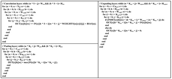 The computing characteristics of each computing layer in SegNet also determine the strategy for hardware implementation on the FPGA. For the convolutional layers, we can see that the main operation of Figure 2 is multiply–accumulate. Moreover, the convolution operation is independent between different input feature maps (different Ccin) and different convolution kernels (different Nk). Such an operation structure is highly suitable for parallel computing acceleration. The main operations of the pooling and unpooling layers are comparison and reorder, so it is suitable for designing an efficient pipeline to accelerate the operations. Considering that operations in the pooling layers and the unpooling layers are independent between different feature maps, parallel multi-threading can be used for acceleration.