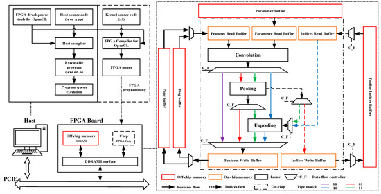 To implement the deployment of SegNet in FPGA, EDSSA uses the overall architecture shown in Figure 3 based on OpenCL. The function execution is mainly realized by the kernels on-chip. The data storage is divided into two parts: on-chip memory and off-chip memory. These are used to store the features and parameters required or generated at different stages of the kernel execution process.