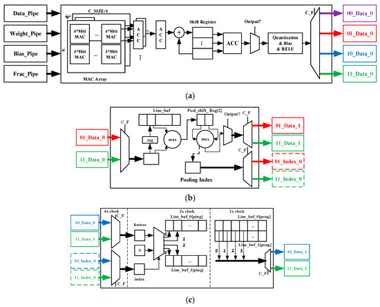 Convolution kernel. As shown in Figure 4a, the core of the convolution kernel is a three-dimensional array of multiply–accumulate units, which contains C × N × Kc/4 units. Each unit is completed by a 4-input 8-bit × 8-bit high-efficiency multiply–accumulate MAC (Multiply Accumulate) IP core. The input of this array is the input features and weights of the corresponding two-dimensional convolution operation, and the output result is the partial sum. The parallelism of the array calculation depends on C × N. A higher C × N means a higher calculation throughput rate and a higher calculation and transmission cost. The parallel accumulators and shift register groups are connected behind the array, which is used to buffer the partial sum, and finally outputs the complete sum. Then, the output values go through operations such as quantization, accumulating bias, and RELU. Finally, the output leaves the kernel through the data pipes selected by the control word C_F and is transferred to the next stage.