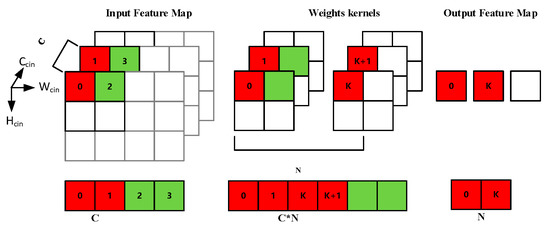 The purpose of design space exploration is to balance the performance and hardware resource consumption of the FPGA accelerator. In EDSSA, the design space exploration is implemented by changing the value of C and N. These two parameters not only determine the throughput rate of the multiply–accumulate array but also affect the data structure of the input and output features and the number of threads in pooling and unpooling kernels. In addition, a higher value of C and N means a higher data vectorization dimension with more resource consumption. EDSSA adopts the vector structure shown in Figure 5 for features, weights, and bias. The size of the parameters C and N is equal to the parallelism C and N of the multiply–accumulate array. Each time the multiply–accumulate array is operated, the controller first copies N identical C-dimensional vectorized features to obtain the C × N-dimensional vectorized features, and then the C × N-dimensional vectorized features and the C × N-dimensional vectorized weights are imported into the array to be computed. Finally, an N-dimensional vectorized output is obtained. The feature vector will adopt an N-dimensional structure when quantizing, pooling, and unpooling.