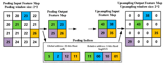 Using relative pooling index addresses: SegNet uses 32-bit floating-point global addresses to store the corresponding pooling index in the caffe [30]-based training and inference. On the one hand, 32-bit floating-point addresses use more hardware resources for transmission and storage. On the other hand, the feature map space information contained in the global address is redundant for the unpooling process. The spatial information of a specific feature in a feature map is correlated with the number of pipeline clock cycles of the unpooling kernel. This means once we have the relative position of the unpooling window in the specified cycle, the unpooling kernel can place the feature correctly. Therefore, EDSSA uses 2-bit fixed-point relative pooled index addresses as shown in Figure 6. Thus, a significant amount of storage space is saved for indices addresses, while simplifying the hardware overhead of address generation.