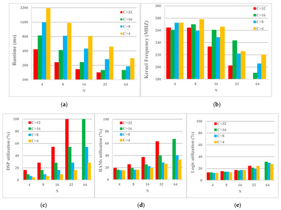 The main factor affecting the runtime of EDSSA is the design space parameters C and N. Figure 8a shows the runtime of EDSSA with different C and N. When C × N is higher, the running speed of system will be faster. This shows that a higher degree of computation and thread parallelism has a direct effect on the speed of the accelerator. Moreover, the running speed increases exponentially when using a lower degree of parallelism. However, for a high degree of parallelism, the speed improvement achieved slows down, and there may even be no gains (such as C × N = 16 × 32 and 16 × 64). This means that there are other factors that restrict the system speed. One of these is the clock frequency of the kernels. Figure 8b shows the kernel clock frequency of EDSSA for different C and N. When a higher degree of parallelism C × N is used, the kernel clock frequency tends to decrease. The higher the parallelism, the more obvious the drop in clock frequency. This may be because the higher parallelism means higher data transmission timing requirements and more pipeline threads, which may reduce the system clock. In addition, when using the same C × N, choosing a larger C can achieve a faster running speed. This means that increasing C (mainly to increase the bit width of the vectorized data of the input features and weight parameters) compared to increasing N (mainly to increase the bit width of the vectorized data of the weight parameters and the number of threads in the pipeline) has a smaller effect on reducing the speed of the system.