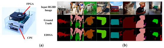 We used the development tool based on an Intel FPGA SDK for OpenCL pro 17.1 to implement the development of EDSSA. The hardware platform is HERO [32], a heterogeneous platform that can be deployed on medium-sized robots. The host uses a CPU system based on an Intel i5-7260U, and the device uses an FPGA board based on an Intel Arria-10 GX1150 connected with the host by PCIE 3.0 x8. The SegNet model is trained based on the PASCAL VOC 2012 dataset [33], and dynamic fixed-point quantization is performed. The input image is an RGB image with a resolution of 224 × 224. The calculation methods of throughput and energy efficiency are given in [34].