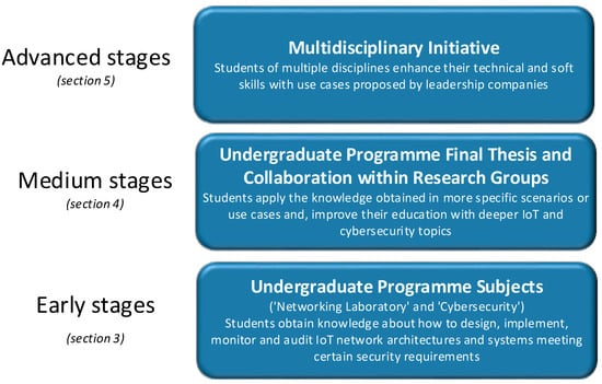As we can see in Figure 1, the pedagogical strategy includes a continuous and step-by-step learning path, starting in the early stages, where undergraduate program subjects provide students with fundamental and technical IoT and cybersecurity knowledge, continuing in medium stages, where students collaborate with research groups for their final thesis elaboration or their interest in a deeper learning, and finishing in the advanced stages, where they take part in initiatives, sharing work activities with university mates of several disciplines.