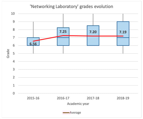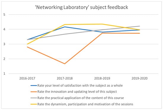The feedback results of the ‘Networking Laboratory’ subject, shown in Figure 16, are mostly around 4 out of 5. These results show how students are very satisfied with the subject. There was a turning point regarding the innovation of the subject in the course 2017–2018. In this sense, several case studies were created and included in the subject, and the feedback results significantly improved the following year. The practical application of the content is highly rated too, and the mark grows year after year.